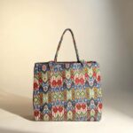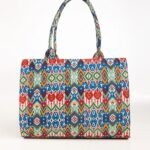 The captivating heart of this tote is its rich, multi-color ikat-inspired pattern. Drawing from traditional textile arts, the design features intricate geometric motifs, playful diamond shapes, and charming teardrop details, all rendered in a brilliant palette of blues, reds, oranges, greens, and whites. This complex yet harmonious interplay of colors and forms creates a mesmerizing visual texture, making each glance at the bag a discovery. It’s a pattern that speaks of distant lands, handcrafted beauty, and adventurous spirit.